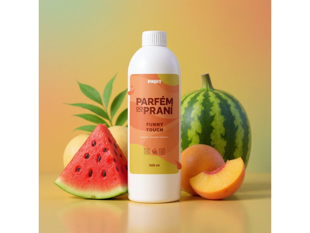FUNNY TOUCH je jemný parfém do praní, který spojuje šťavnaté tóny melounu, broskve a okurky se svěžími zelenými akcenty a sladkostí cukrového melounu. Základ kompozice tvoří hebký mošus a jemná vanilka, které dodávají vůni měkkost a hřejivost. Díky této kombinaci je vůně ideální i pro praní dětského prádla – nejen pro svůj hravý, svěží charakter, ale i pro své výjimečné složení.