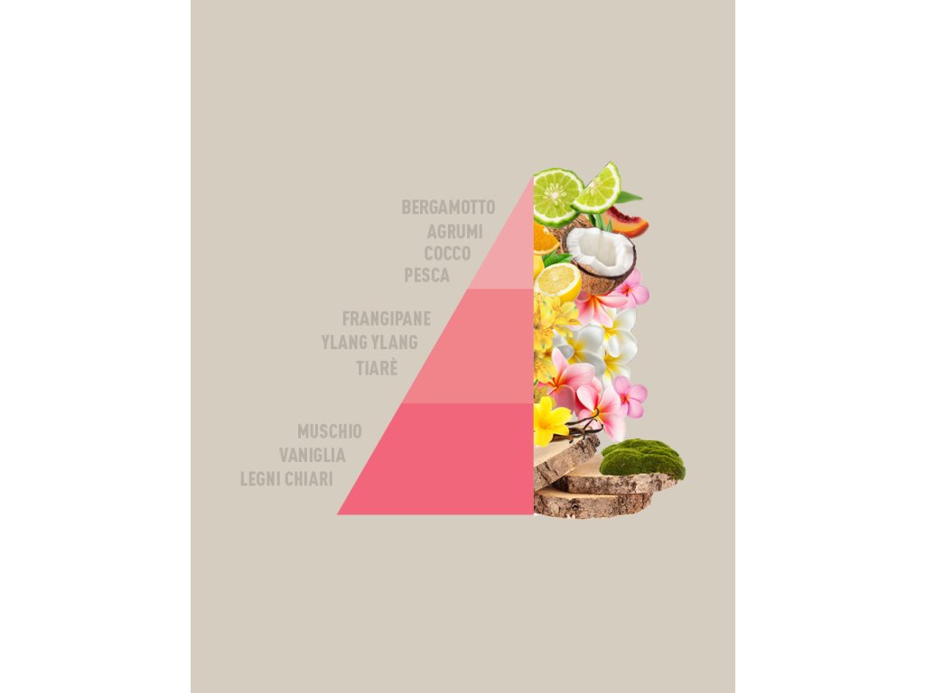 vůně bergamotu, citrusu, kokosu, broskve, Ylang-Ylang, Tiare, pižma, světlého dřeva a vanilky