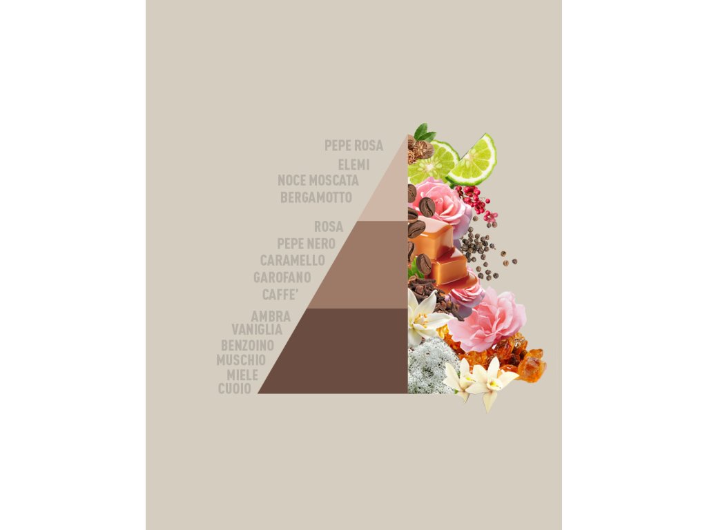 vůně růžového pepře, bergamotu, elemi, muškátového oříšku, růže, černého pepře, karamelu, hřebíčku, kávy, ambry, vanilky, benzoinu, medu a kůže